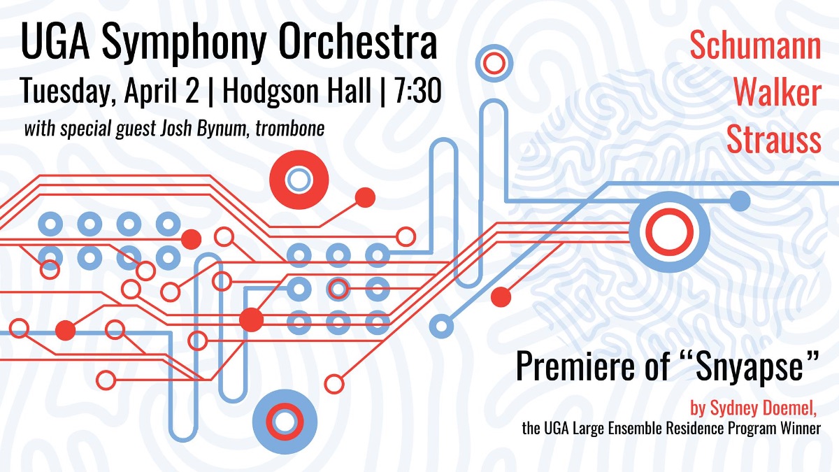 The UGASO will also be performing the world premiere of a piece entitled "Synapse" written by student composer Sydney Doemel. "Synapse" is the culmination of the inaugural Large Ensemble in Residence Program at the Hugh Hodgson School of Music. Composition students submitted proposals and score samples during the fall semester. Scores were evaluated by a panel of HHSOM faculty members. The winning composer works closely with the orchestra, wind ensemble, or chorus and its conductors in refining the work through reading sessions with the ensemble and meetings with the conductors.