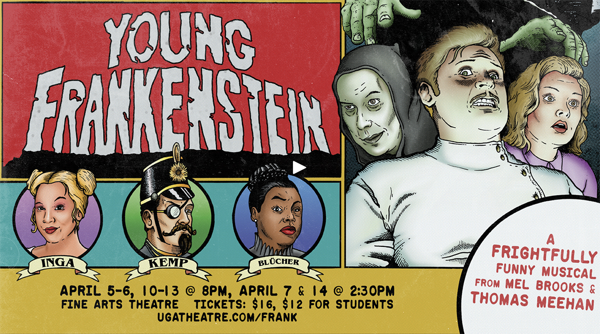 Young Frankenstein marks the end of UGA Theatre’s 86th season, and David Saltz, head of the theatre and film studies department, said that he “can’t imagine a more fun way to end this amazing year of theater. Mel Brooks is one of the funniest men who ever lived, and George Contini is a comic genius in his own right. The combination of these two talents is sure to produce something wonderfully unique.”