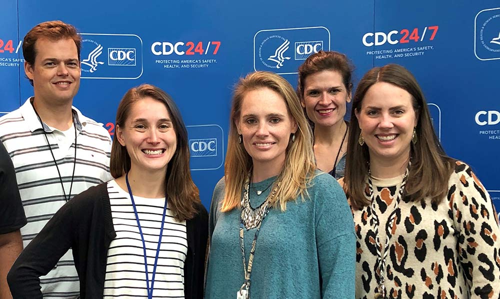 Image: The CDC staff of scientific/medical visualization experts – Front row: Stephanie Pfeiffer Rossow (BSA ’13), Alissa Hogan Eckert (BFA ’04), Jennifer Hulsey Oosthuizen (BFA ’05); Back Row: Dan Higgins (BFA ’93), Meredith Boyter Newlove (BFA ’04) (photo provided by Dan Higgins)