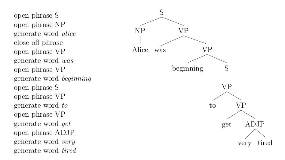 Image: Processing steps in the computer model on the left, phrase structure on the right. See Table 1 of Brennan et al.