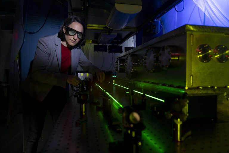 Image: Reber adjusts one of the lasers she uses for her research in her lab at the Chemistry Building. (Photo by Andrew Davis Tucker/UGA)